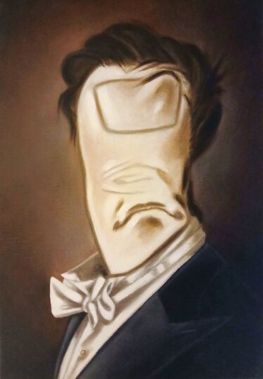 Il volto viene sostituito dal dito, che si fa icona viva del personaggio, richiamandone l’identità senza scadere nella caricatura. Questa scelta sottolinea l’abilità unica dell’artista nel fondere eleganza, sottile ironia e profondità culturale.