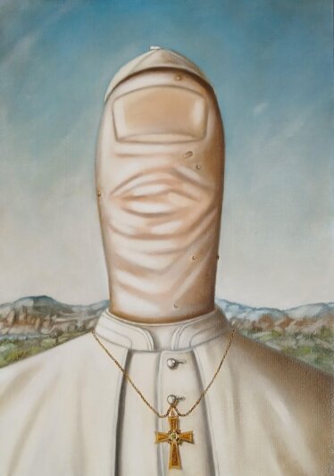 Gli occhi, sebbene inesistenti, sembrano avvolti e nascosti tra le rughe della saggezza, penetrando nell'animo dell'osservatore e trasmettendo una profonda serenità. La tiara papale, suggerita dalle linee morbide del dito, si appoggia con grazia sul capo, simbolo del potere spirituale e temporale. Lo sfondo trasmette una serenità e un'aura celeste, e sottolinea la centralità della figura papale. Il maestro Raffaele Ciotola, con un gesto apparentemente semplice, cattura l'essenza della massima autorità religiosa, invitandoci a riflettere sulla fede, sulla spiritualità e sull'arte, che deve sempre rispettare la sensibilità e saper raggiungere anche i più giovani con una sana e genuina creatività artistica."
