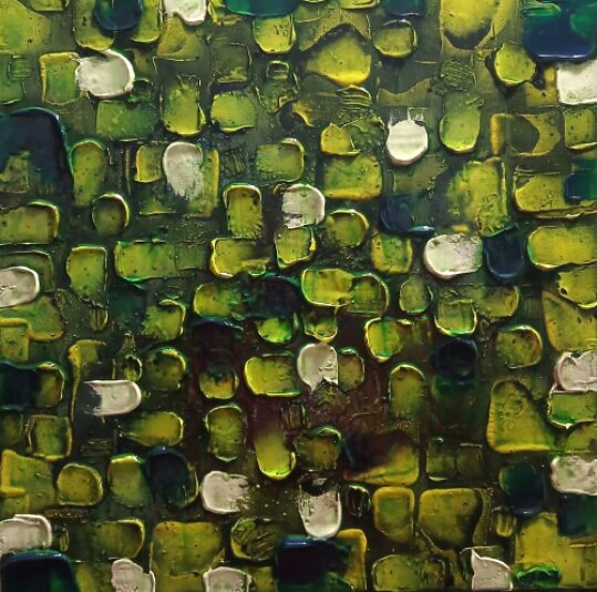 Il verde non è qui inteso come semplice colore decorativo, ma come linfa vitale che scorre attraverso una struttura geometrica complessa. La scomposizione in moduli crea un ritmo visivo che ricorda la crescita cellulare: ogni tassello è un frammento di esistenza che si incastra perfettamente in una visione d'insieme. I bagliori dorati e i contrasti profondi agiscono come scintille di luce che emergono dall'oscurità, simboleggiando il momento esatto in cui la vita riprende il sopravvento.